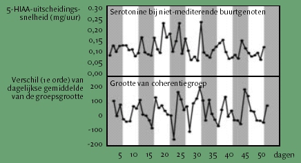 Serotonine stijgt door de meditatie. Links staan de waarden van de controlegroep.